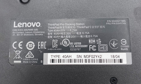 Lenovo ThinkPad Pro Docking Station SD20Q11985, Type 40AH, with Key