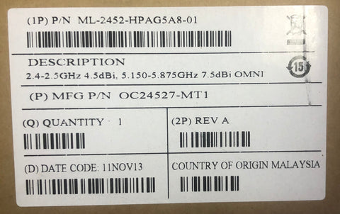 Motorola Dual Band WIPS Sensor Model: ML-2452-HPAG5A8-01 Antennae Type: Dual-band Dipole Omni Frequency: 2400-2500/4900-5900 MHz Gain: 7.5/ 8.0 dBi