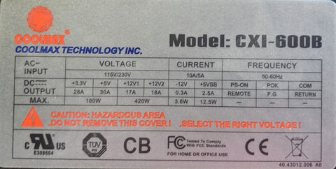 Coolmax Desktop Power Supply Model: CXI-600B Max Output: 600W Form Factor: ATX Input Voltage: 115 / 230 V